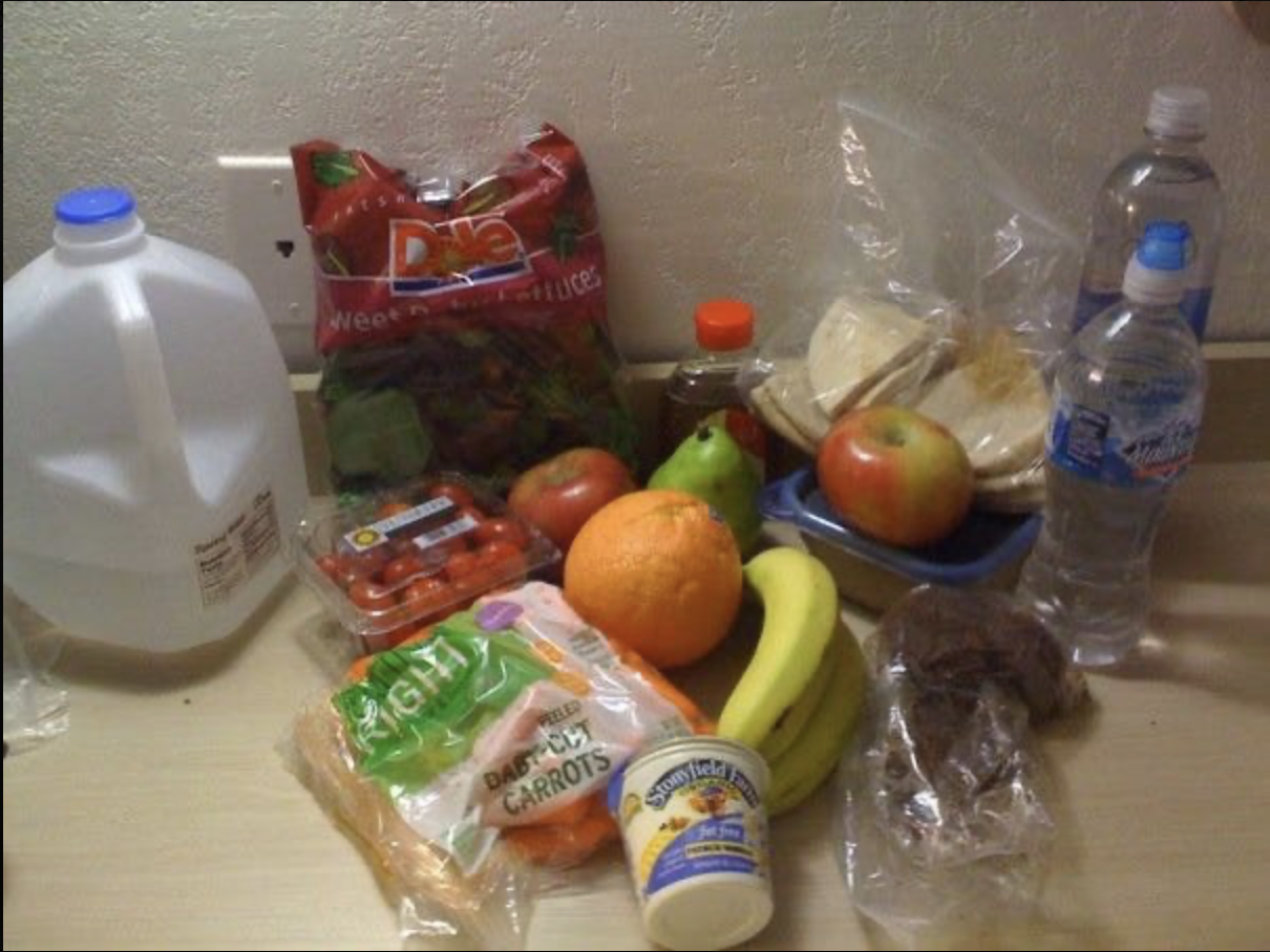 1 liter of electrolyte water, snack bar, piece of fresh/dried fruit